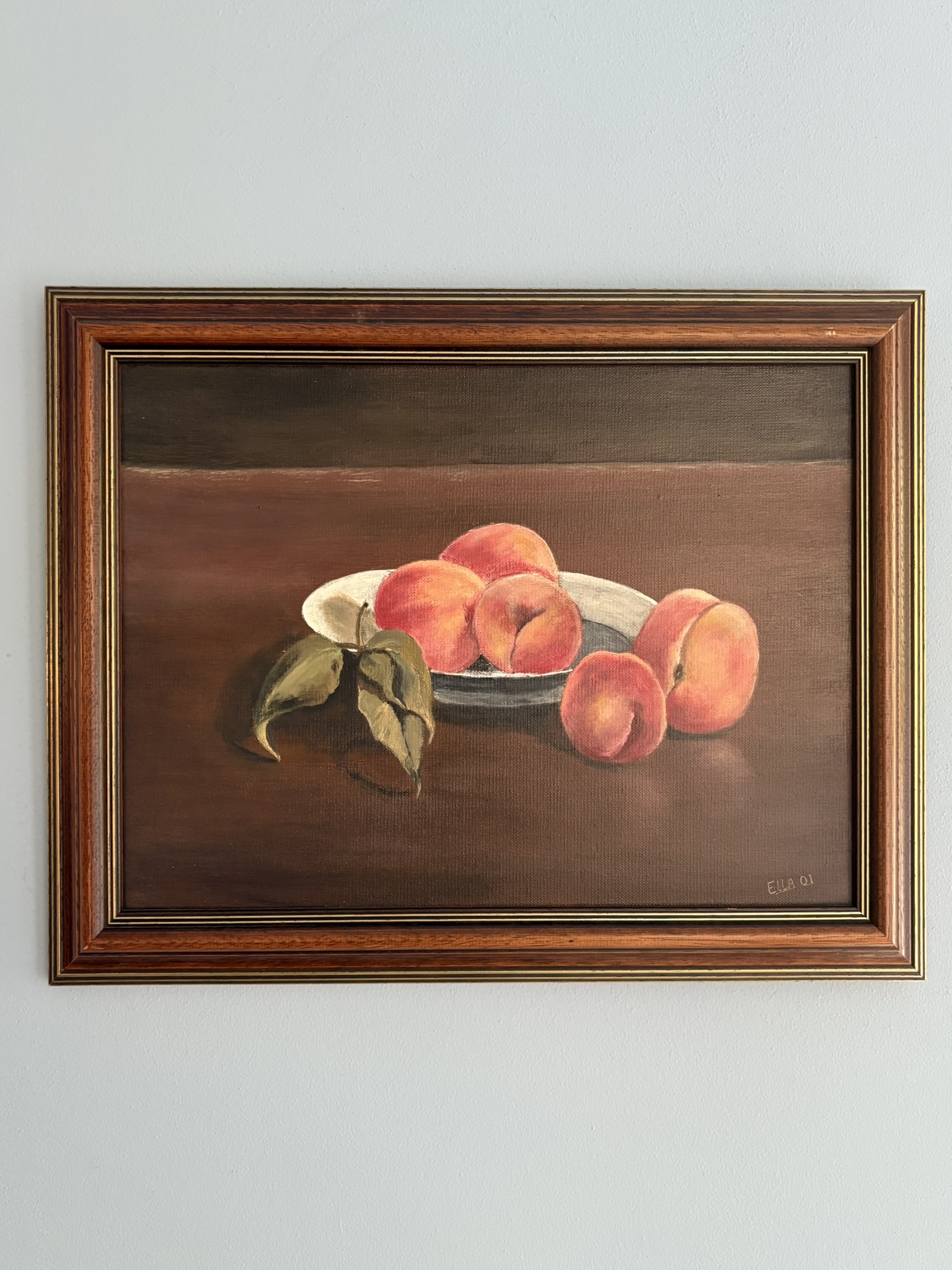 Zoet en stijlvol. Deze zachte perziken zitten in een mooie klassieke houten lijst.